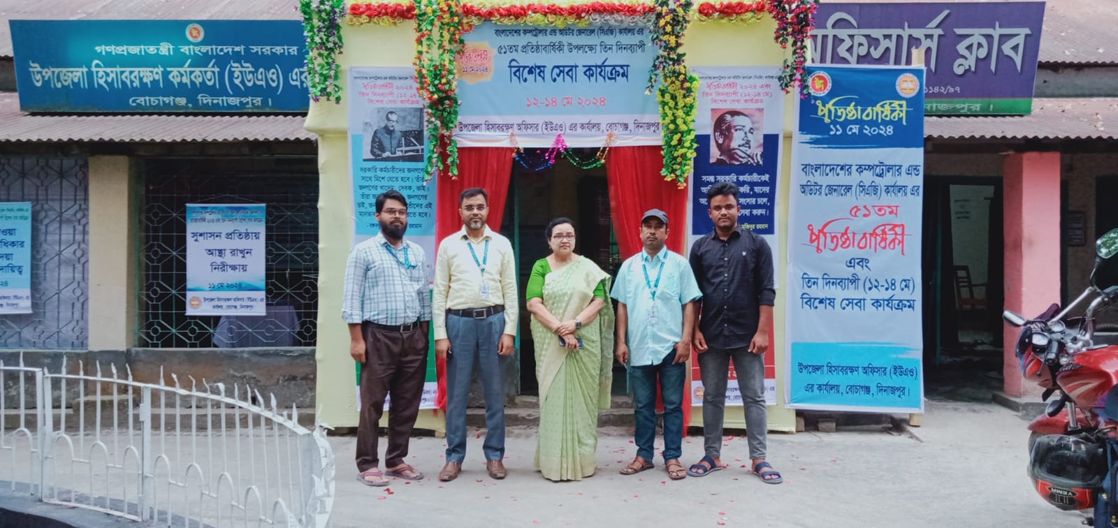 ইউএও/বোচাগঞ্জ, দিনাজপুর কর্তৃ কর্তৃক আয়োজিত বাংলাদেশের কম্পট্রোলার এন্ড অডিটর জেনারেল কার্যালয়ের ৫১ তম প্রতিষ্ঠা বার্ষিকিী উপলক্ষ্যে বিশেষ সেবা কার্যক্রম এবং আলোচনা সভা আয়োজনের স্থির চিত্র।